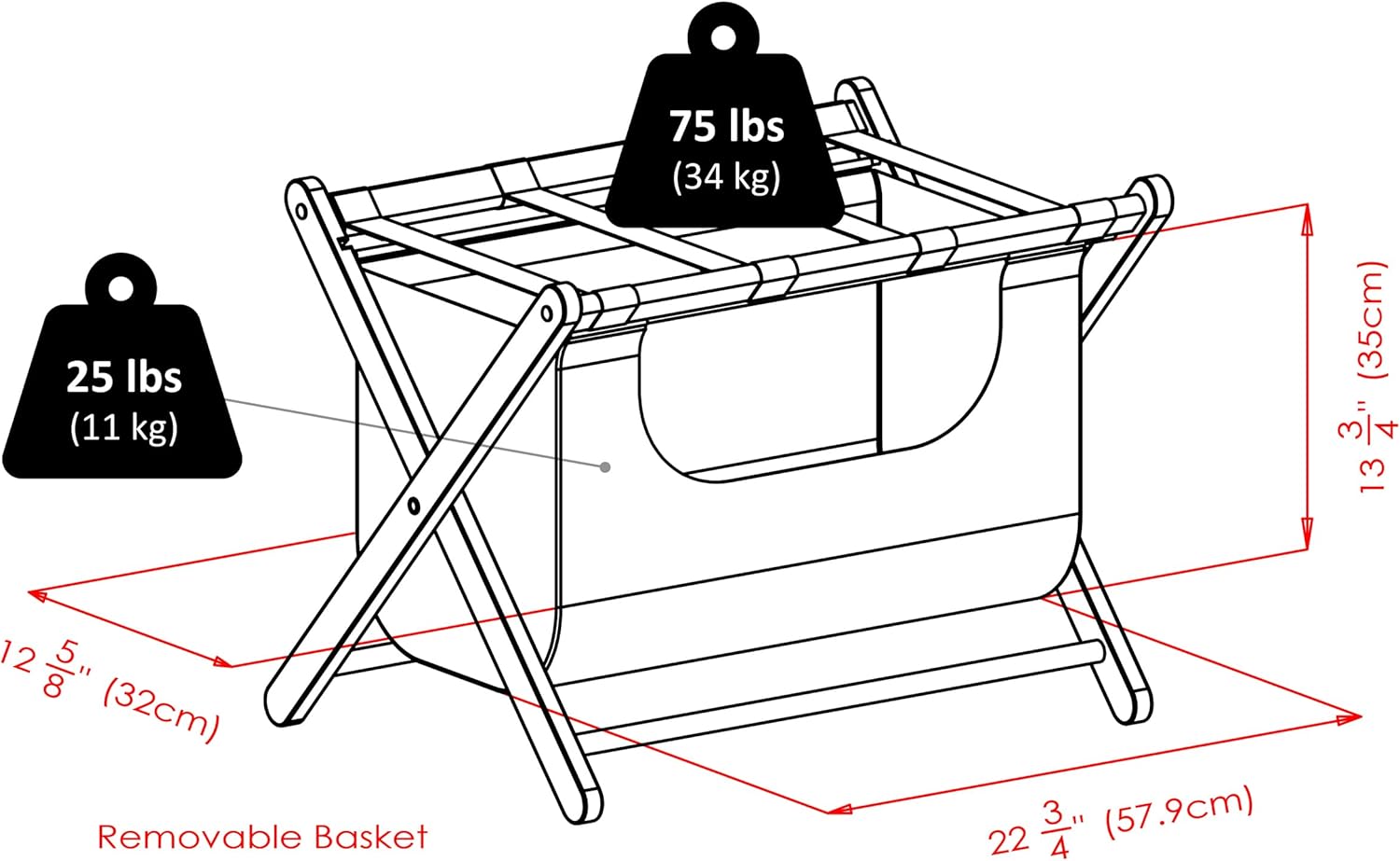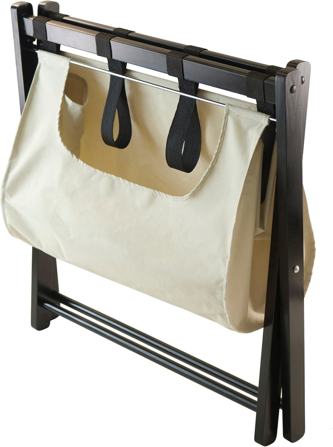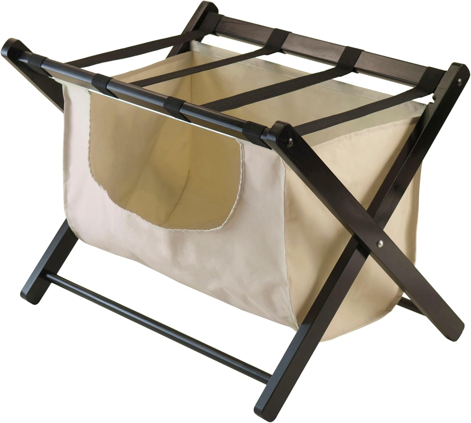 Banco plegable de madera sólida marca Winsome Dora, ideal para colocar maletas, ropa de viaje o como soporte extra en habitaciones de visitas. Tiene correas de nylon resistente que soportan hasta 75 lb (≈ 34 kg) en la parte superior. Incluye cesta de tela Oxford 100 % poliéster reforzada con tablero rígido para guardar la ropa sucia o accesorios, fácilmente removible mediante una barra cromada. Diseño cappuccino espeso / espresso, se dobla para almacenamiento compacto; viene completamente armado. Dimensiones aproximadas: 26,5 in largo × 18,7 in ancho × 20 in alto.