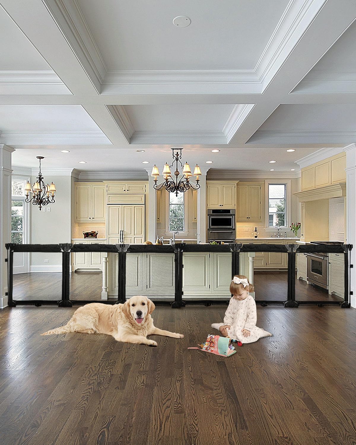 Corralito modular de seis paneles con estructura estable y malla resistente, ideal para crear un área segura para bebés o mascotas tanto dentro como fuera del hogar. Su diseño plegable permite ajustarlo fácilmente a distintas configuraciones.