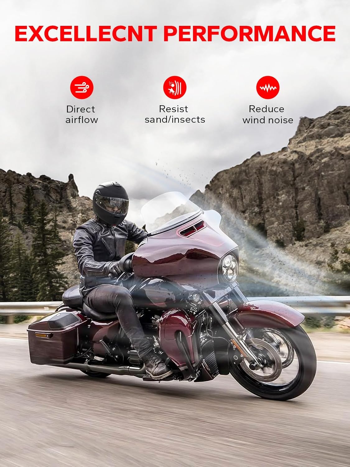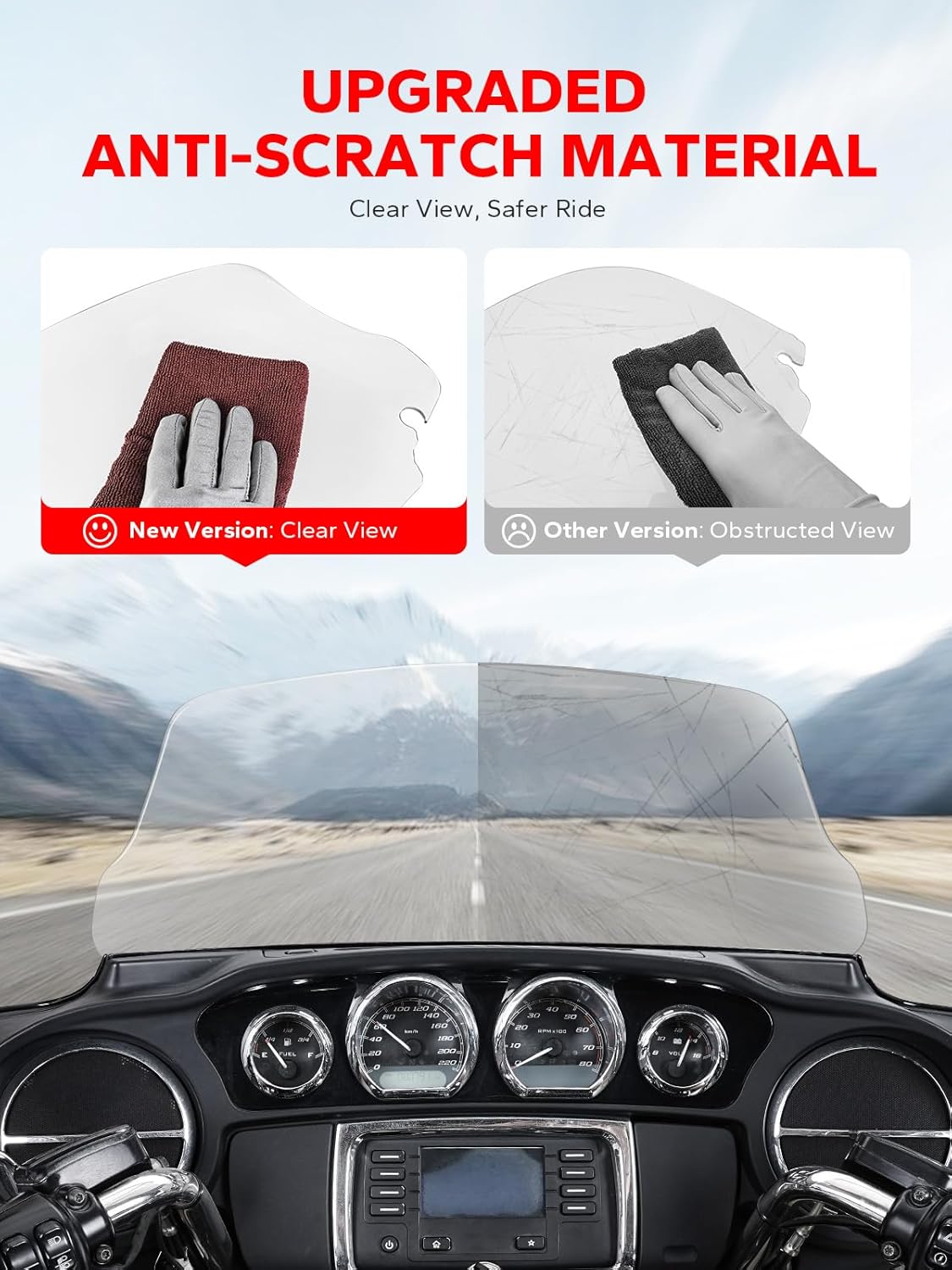 Parabrisas Amazicha de diseño “wave” de 10 pulgadas, compatible con modelos Harley-Davidson Touring, Street Glide, Electra Glide y Ultra Limited entre los años 2014 a 2023, excepto algunos modelos FLHX/FLHXSE. Fabricado en policarbonato transparente resistente, con bordes suavizados para mayor seguridad. Mejora la resistencia al viento, reduce turbulencias al conducir, y aporta estilo personalizado al frente de tu moto.