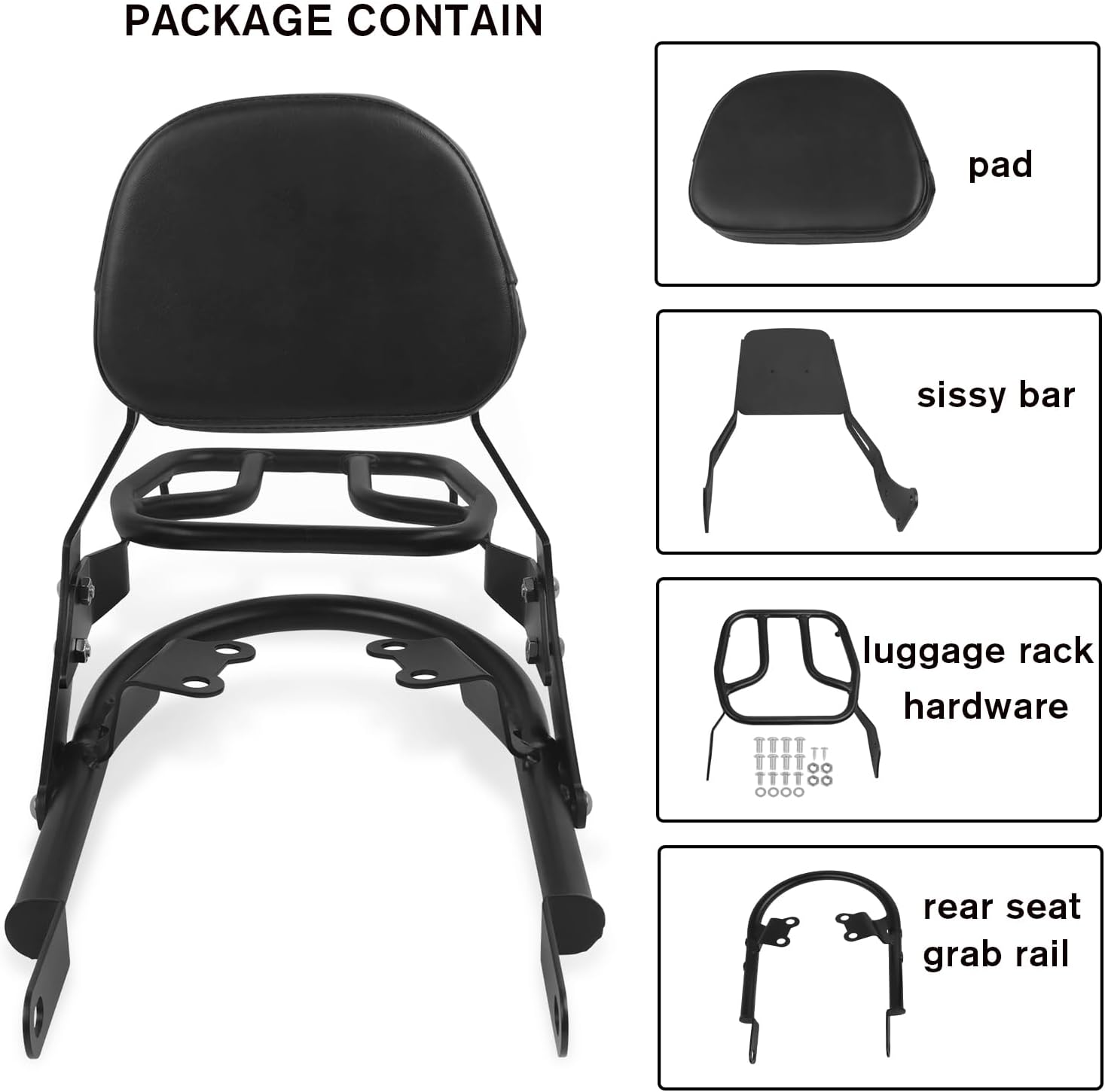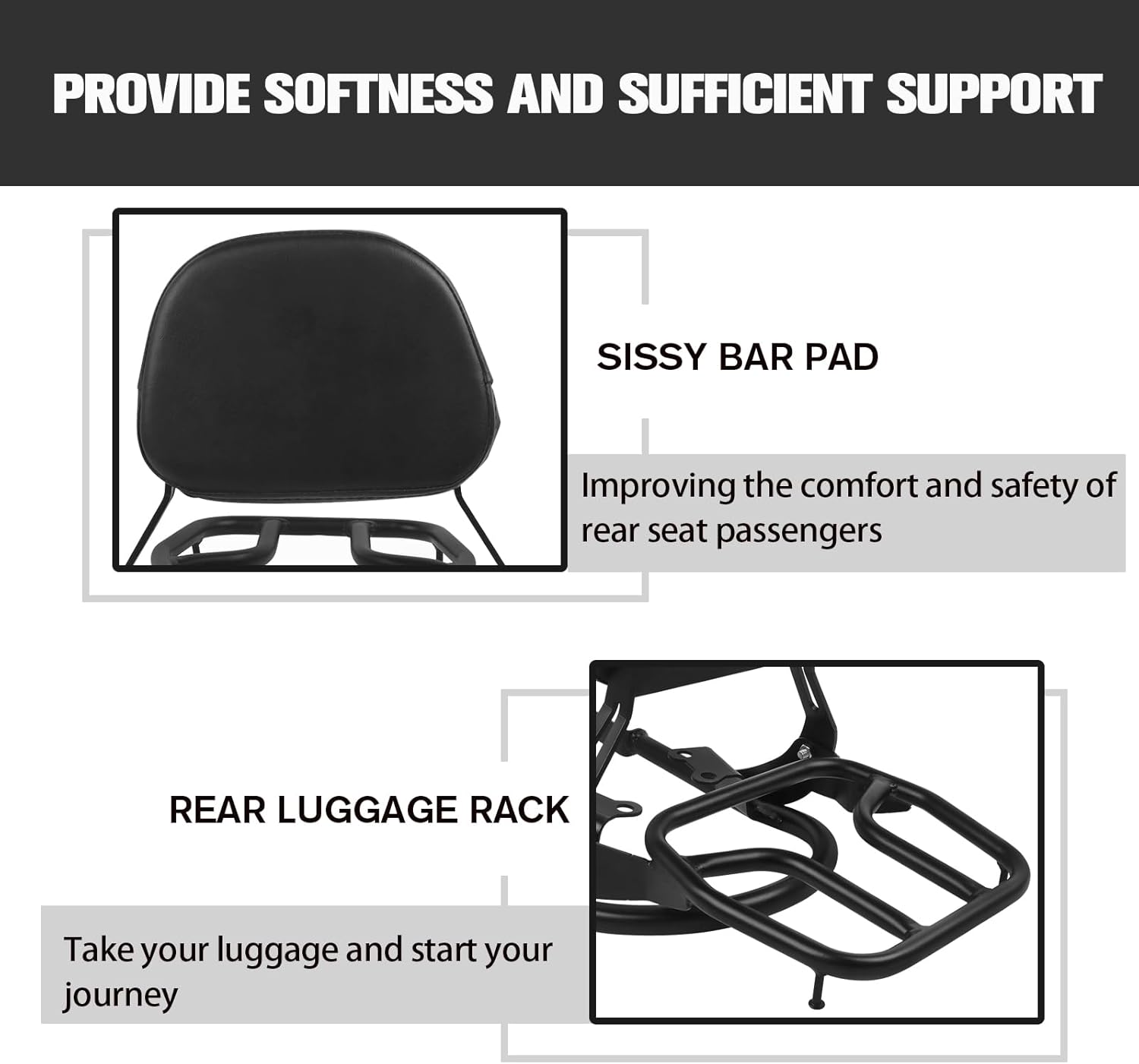 Respaldo trasero CHIFUN compatible con Triumph Bonneville T100/T120 de los años 2017 a 2022, pinta negro mate para combinar con el estilo clásico. Incluye barra “sissy” + rack porta equipaje, ideal si viajas con pasajero o necesitas transportar maletas, bolsas o equipo ligero. Acabados resistentes al clima, instalación directa con tornillería incluida, diseño que mejora la comodidad sin afectar la estética original de la moto.