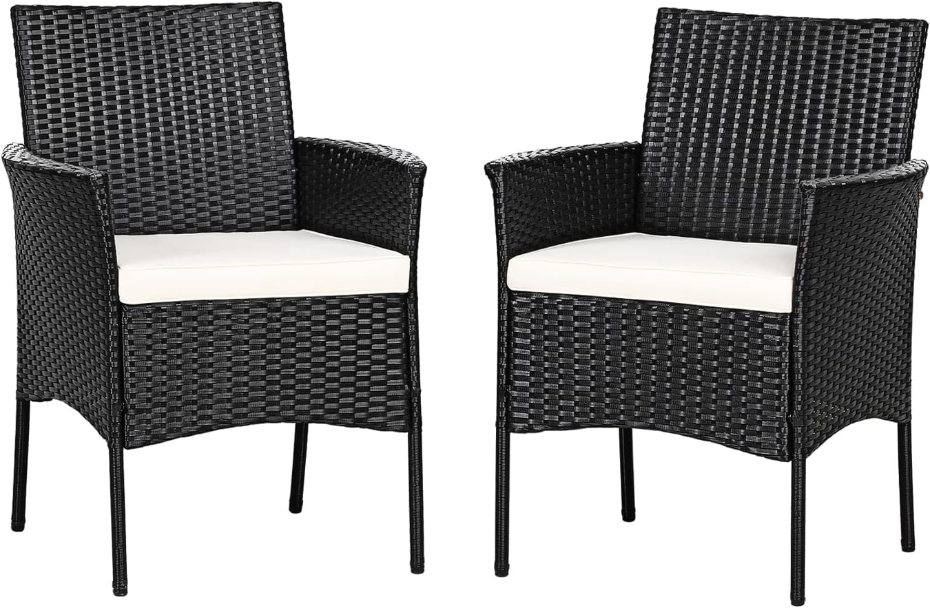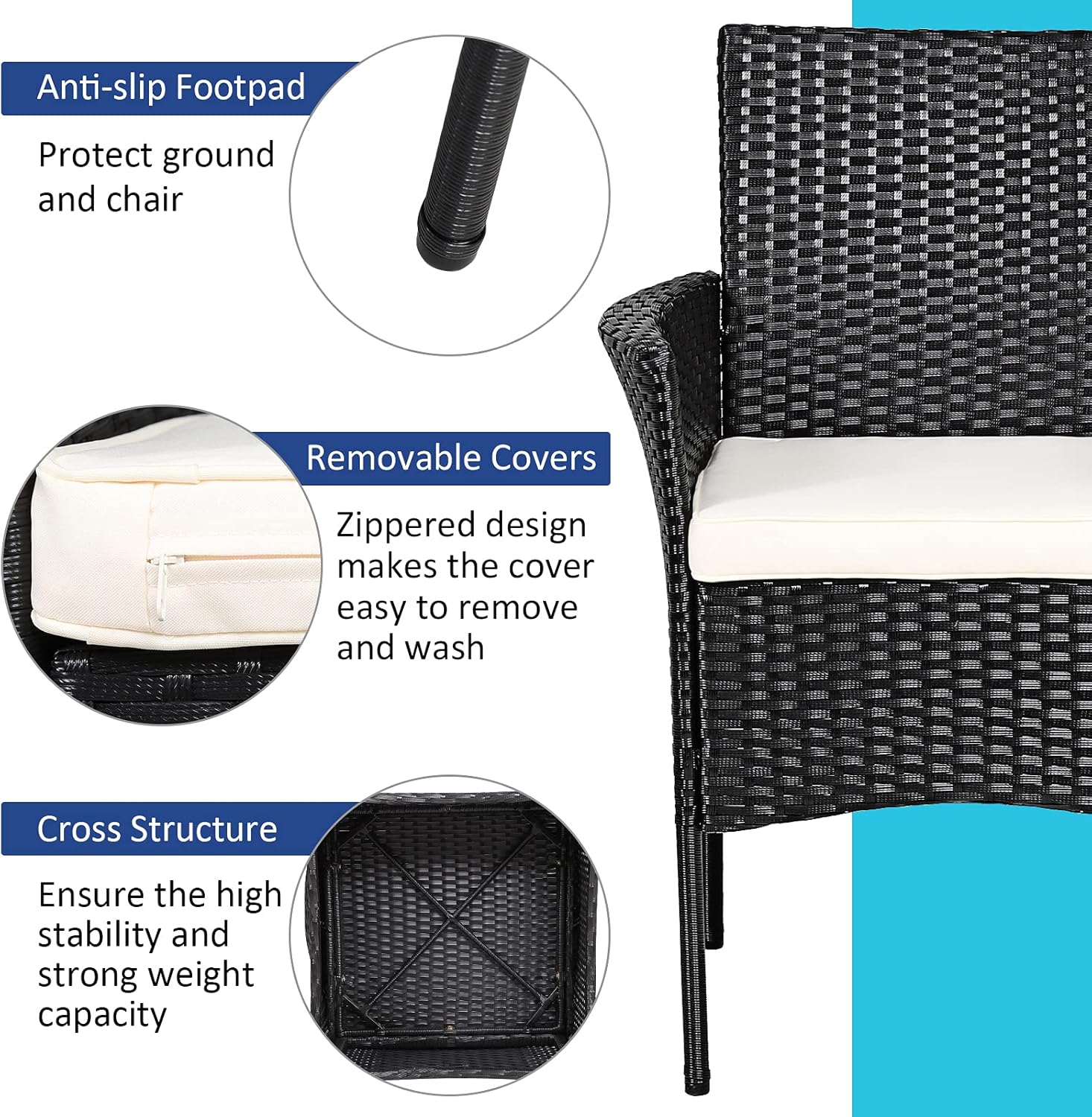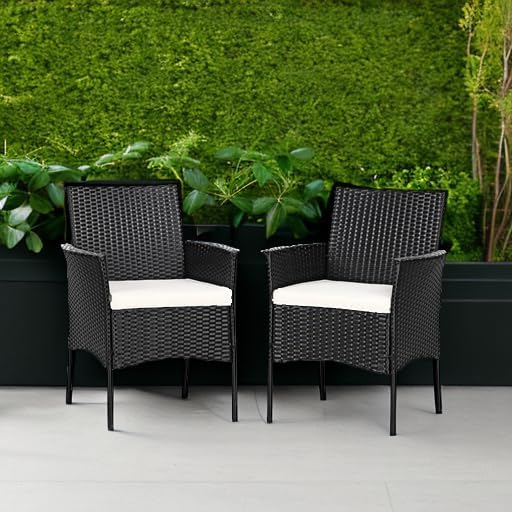 - Diseño ergonómico: el juego de 2 sillas de comedor para exteriores tiene un soporte confiable y ergonómico. Sentado en esta resistente silla de mimbre, equipada con un amplio respaldo, reposabrazos y suaves cojines extraíbles, te asegurará que disfrutes de un tiempo de ocio completamente relajante. Puedes utilizar nuestras sillas de ratán para exteriores con tus amigos o para discutir las ideas de la vida juntos después del té y la cena.
