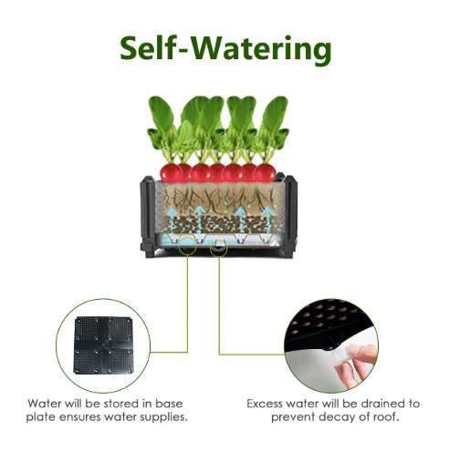Incluye discos de auto-riego y agujeros de drenaje