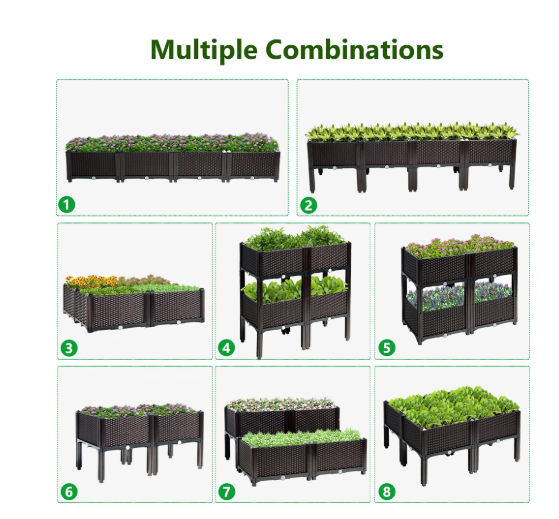Este conjunto incluye cuatro maceteros elevados ideales para cultivar flores, vegetales y hierbas, con estructura resistente y facilidad para montaje.