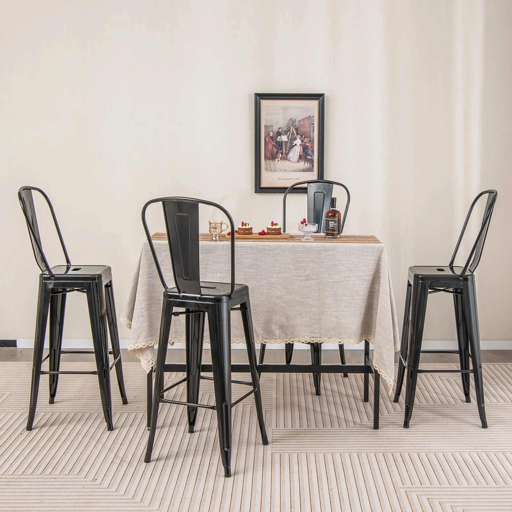 Conjunto de cuatro taburetes industriales metálicos con respaldo alto y diseño apilable. El respaldo es removible, lo que permite usarlos como taburetes bajos si se desea.