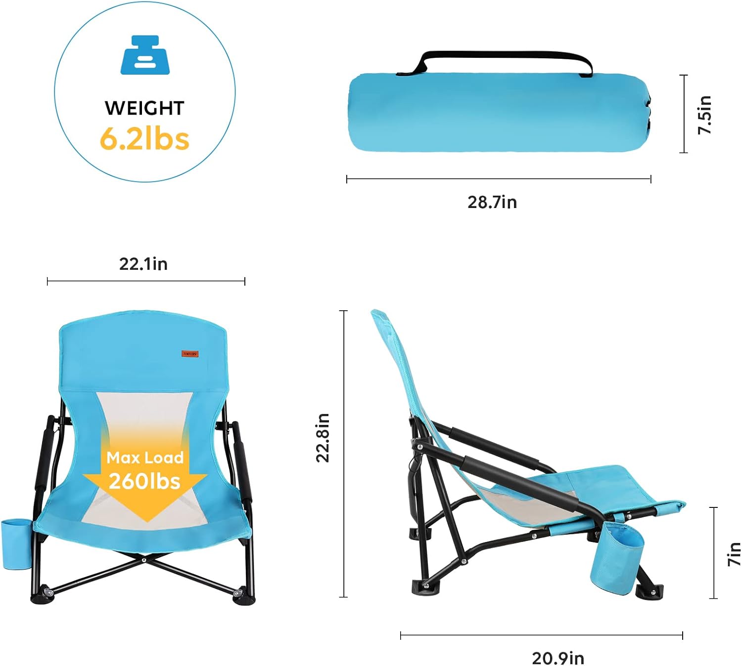 Set de 2 sillas de playa bajas TOBTOS, diseñadas para mayor comodidad en arena, camping o conciertos. Cada silla tiene estructura de acero resistente que soporta hasta ≈ 136 kg, asiento de perfil bajo para relajarte cerca del suelo, y respaldo inclinado para mayor descanso. Incluyen portavasos integrados, bolsa de transporte y sistema plegable compacto para llevar fácilmente. Medidas aproximadas abiertas: 58 × 56 × 66 cm (ancho × fondo × alto). Ligeras, estables y pensadas para disfrutar al aire libre sin complicaciones.