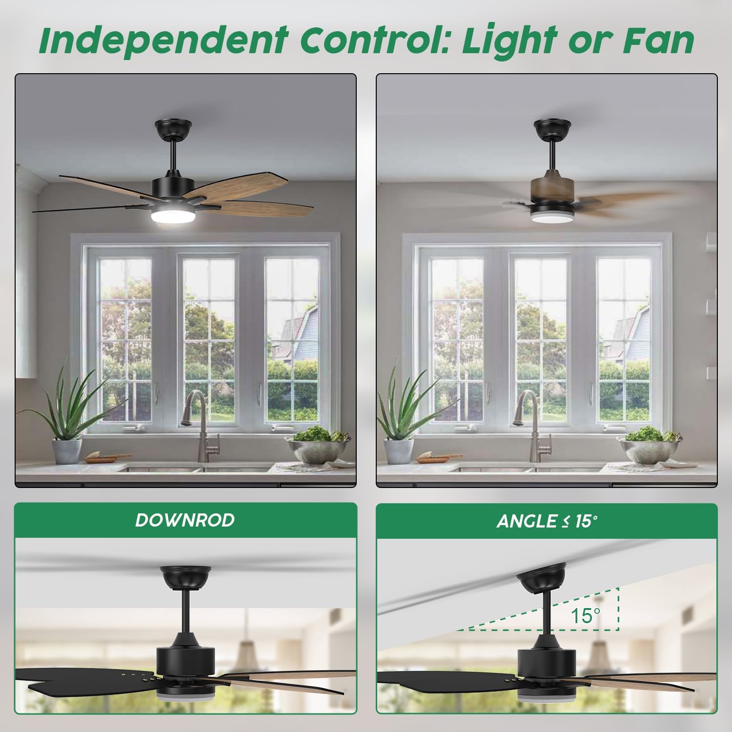Ventilador de techo, con luz, control remoto, reversa y 6 velocidades. Negro ó café